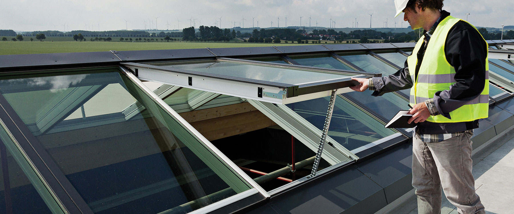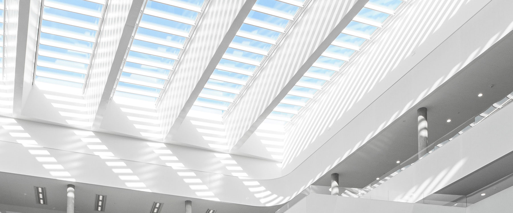 VELUX atrium solutions consist of multiple rows of longlights, supported only by structural beams, that form large glazed areas of identical-looking venting and fixed units. Designing your building with an atrium longlight solution will help you benefit from all the functionalities offered by the modular skylights system, such as integrated chain actuators, blinds and low pitch.