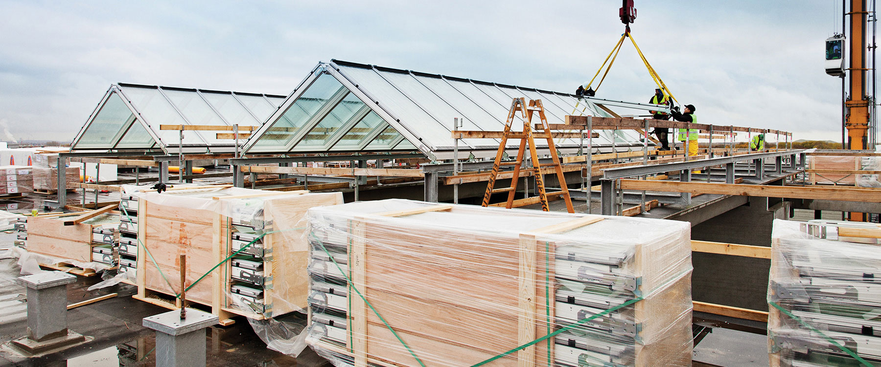 From delivery on the construction site to fastening the final screw, VELUX Modular Skylight (VMS) Rooflights can be installed up to three times faster than other rooflights. Modules are hoisted directly from the pallets onto the prepared sub-construction and fastened within minutes. Final flashing and cladding is applied with prefabricated components, built to fit.